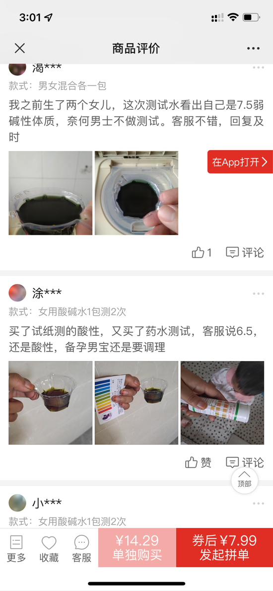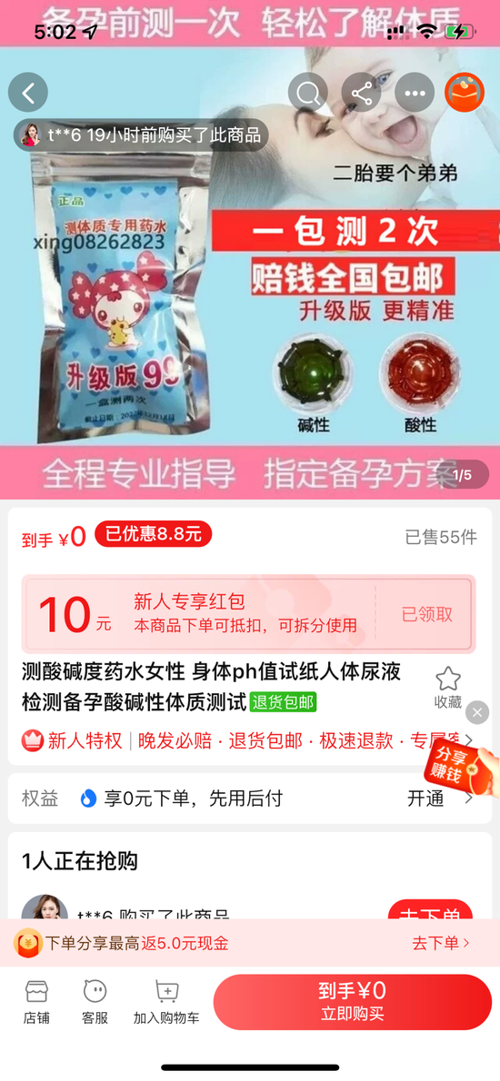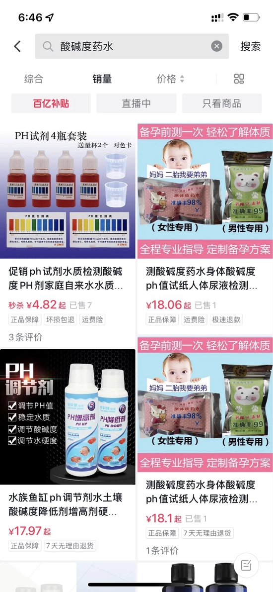 2022年初,朱思码记在拼多多平台“幸孕天使49”店铺内以14.8元人民币的价格,购买了全称为“测酸碱度药水身体酸碱度ph值试纸人体尿液检测备孕酸碱度体质测试”的“女用体制水+男用精子水”的商品。店铺显示,仅该单品就拼单超过1.3万件,商品评价超过500条,店铺累计拼单售出超过1.8万件商品。