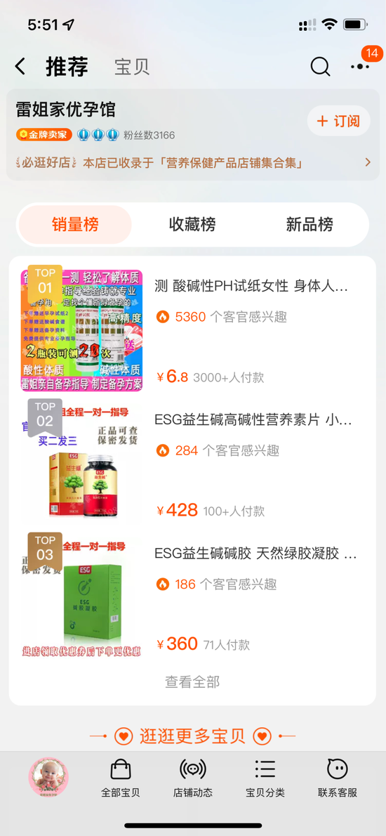 以淘宝网为例,在名为:“雷姐家优孕馆”的店铺中,我们就发现了同款测酸碱度的药水试剂,和推荐销售的同款药品凝胶。值得注意的是,上述店铺已被淘宝网官方收录为必逛好店,是一家开店时间超过12年的三皇冠老店。