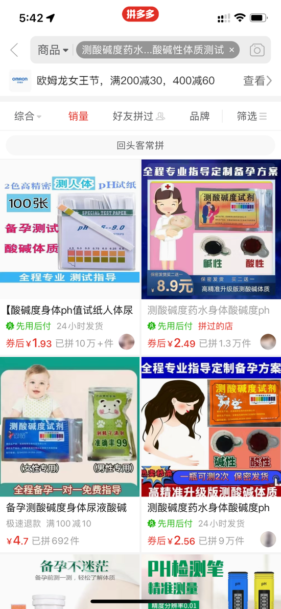 而出售相关商品的多家店铺,平台显示他们多为3-4年以上的老店,拼单成交数额少则几百,几千,多则10万+起步——备孕用酸碱试剂,是拼多多平台面向下沉市场的爆款产品,而平台采用拼单模式则更容易通过分享来助商家取得更大的订单量。