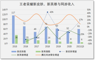 财报数据显示,腾讯在2021Q3,本土市场游戏收入为人民币336亿元,同比增长5%。国际市场游戏收入为人民币113 亿元,同比增长20%,腾讯在2021年一月发布《王者荣耀》版本更新后,靠着8款皮肤入账40多亿元。