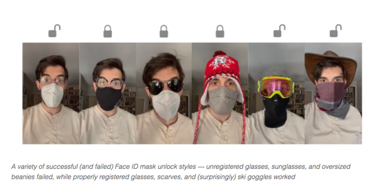 在The Verge记者的测试过程中,在正常佩戴口罩,且戴固定眼镜的前提下,解锁成功率相当高。不过,当情况稍微有变化,换一副墨镜,或者戴一顶帽子手机就很难识别。更“大离谱”的是,如果换一副苹果识别系统不认识的眼镜,也可能会导致识别失败。