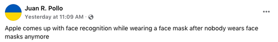 “苹果推出了口罩面部解锁功能,在所有人都不再戴口罩之后。”