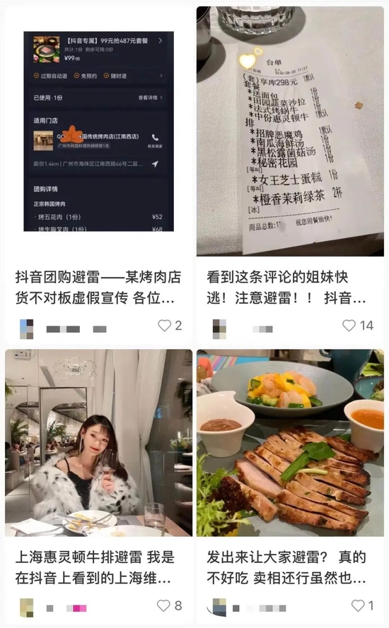 更多的投诉来自消费者,比如团购产品无法使用、过期无法退款、商家提供的服务和菜品不实等。在抖音、微博、小红书等社交平台,也不乏类似的“踩坑”“避雷”案例。