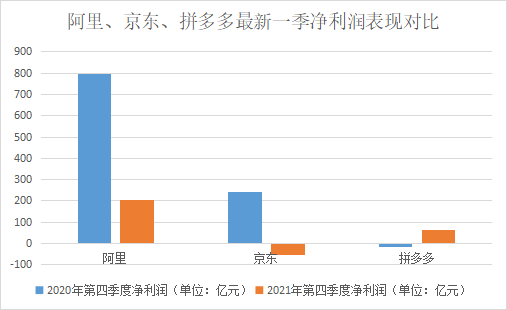 本财季内,阿里的净利润为204.29亿元,同比下降75%;京东第四季度归母净利润亏损52亿元,上年同期盈利243亿;拼多多归属于普通股股东的净利润为66.20亿元,创下上市以来的最好成绩。