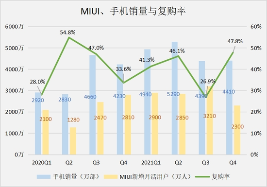 值得庆幸的是,复购率在去年第四季度回暖,可能一部分原因是小米12即将上市,米11、11ultra等高端机型的性价比策略,以及双11大促,重新拉回了米粉。