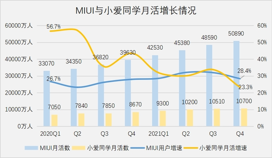 截至去年年末,MIUI用户月活为5.089亿人,同比增长28%,小爱同学月活为1.07亿人,同比增长23%,两大关键指标保持高速增长,说明小米依靠硬件获客的逻辑没有任何问题。