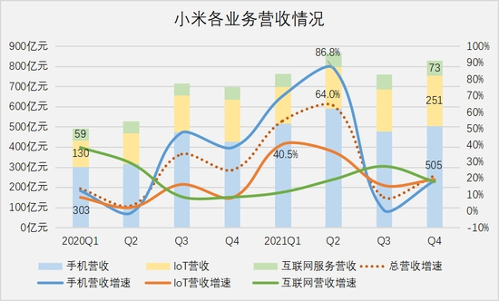 手机与IoT营收规模长期占比超过八成,且在2021年提出高端化之后,两大硬件业务收入占比持续扩大。小米越来越“硬”是不争的事实。