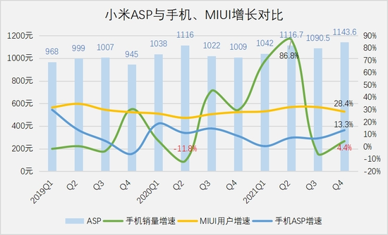 手机ASP是观测小米高端化的核心指标,截至去年第四季度,小米ASP为1143.6元,同比增长13.3%。值得注意的是,最近两年的二季度是小米ASP的峰值,这与复购率的峰值完全重合,说明提升ASP不能靠新用户,只能依靠米粉。