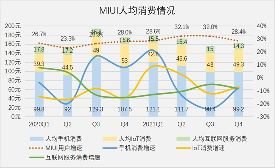 小米硬强于软的情况,叠加MIUI用户高速增长,使得人均季度消费不断走低。去年四个季度,MIUI人均消费分别为179.4元、172.7元、156.4元、162.8元,最近六个季度呈下滑态势。一部分原因是国内电子消费市场,特别是手机行业下行。