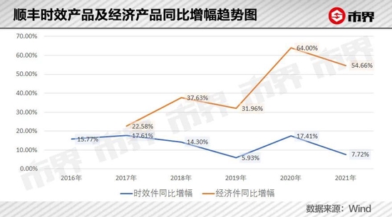 2016年至2021年,顺丰国内时效产品的收入增幅呈现跌宕下滑的趋势,从15.77%降至7.3%,但经济件的同比增幅从2017年的22.58%波动上涨至2021年的54.66%,增长潜力显而易见。
