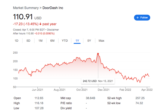 截至发稿,DoorDash目前股价大约110美金/股,对比去年1月15日股价高点242美金来计算,已经下跌55%。Doordash的股价在很多人看来,对于Instacart有一定的指导作用。