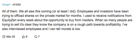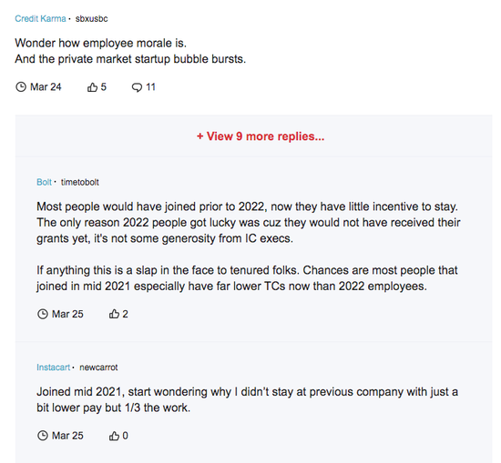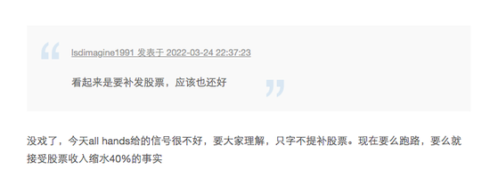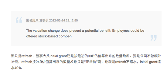 有评论表示很多人几乎已经没有什么动力留在公司内部。同时,也有人表示,2021年中之后加入公司的员工薪资整个包裹已经比调整估值后的员工薪资低非常多了。他表示,这对于老员工来说,简直像在打脸。