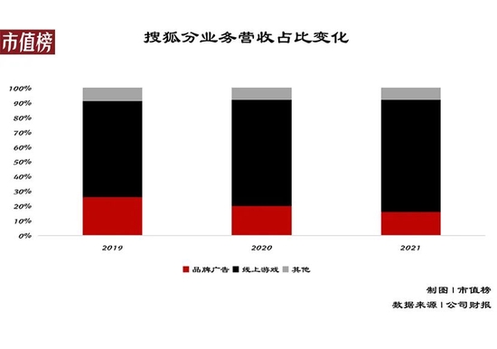 尽管张朝阳过去几年一直在强调搜狐的媒体属性,但如今的搜狐看上去更像一家游戏公司。2021年,线上游戏总收入6.382亿美元,贡献了搜狐76.38%的收入,15年前发布的《天龙八部》,依旧是搜狐唯一拿得出手的游戏。三季度搜狐推出了小浣熊百将传,但市场反响一般。