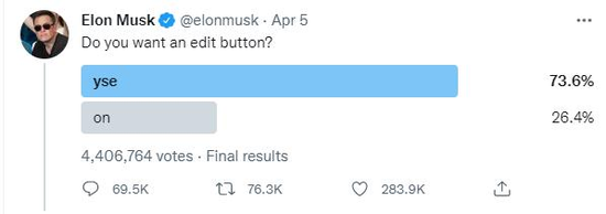 就在被曝出跻身第一大股东的次日,马斯克在Twitter上发起投票:“你们想要编辑按钮吗?”这条推文获得5.6万次转发,约441万投票者中的73.6%表示支持。Twitter随后表示,将在未来几个月内启动编辑功能的内测。