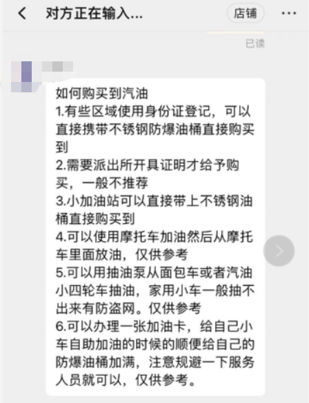 烧油的发电机使用起来简单,但准备却比较麻烦。首先汽油柴油就不是随便可买的商品,从店家给出的“如何购买到汽油”的回复中可见其难度:去派出所开证明,或者给摩托加油再从摩托的油箱取油……