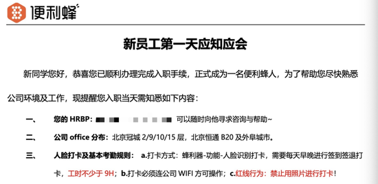 在便利蜂的工作并不轻松,《新员工第一天应知应会》要求人脸识别打卡,并提到基本考勤规则:“需要每天早晚进行签到签退打卡,工时不少于 9H(小时)”。这意味着,如果工时小于9小时,员工甚至无法打卡下班。多位便利蜂员工告诉Tech星球,大多人不会只工作9小时,工作11小时甚至更多才是常态。