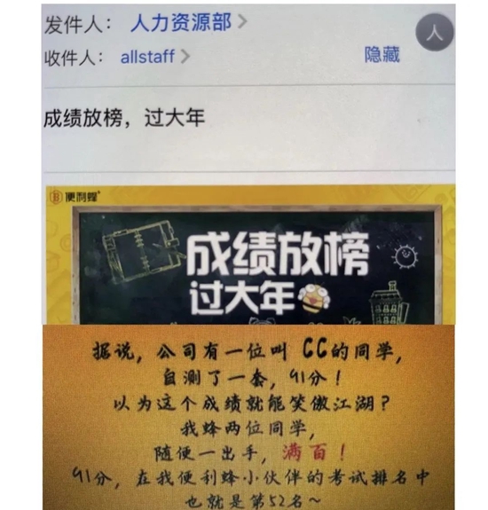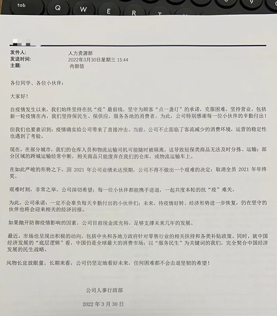 不幸的是,就在今年3月30日,便利蜂发出全员邮件,宣布取消年终奖。理由是:由于疫情,2021年公司业绩未达到预期。