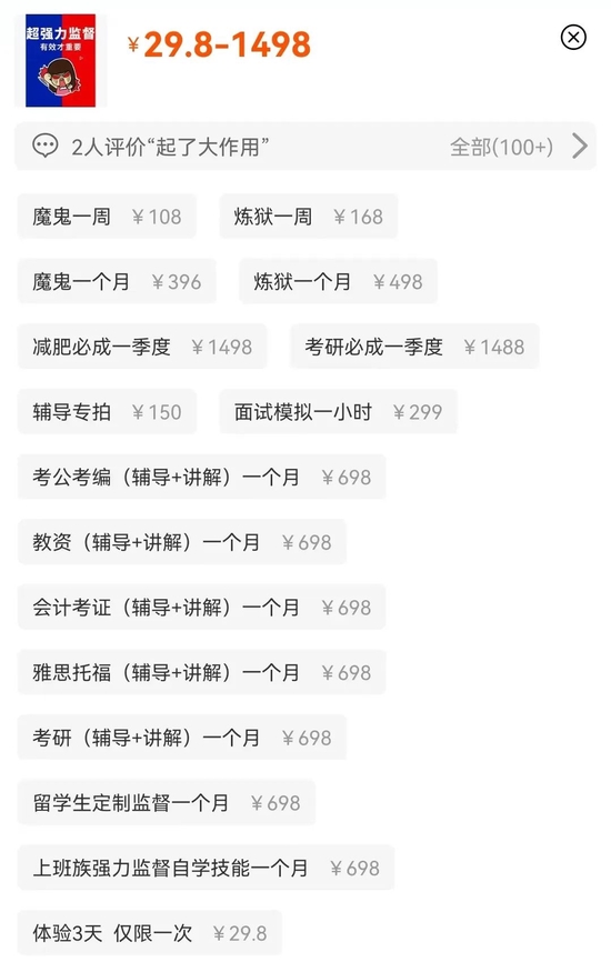首先,林钰没有提供服务细则,只是给出了一个模糊的说法:价格越高监督次数越高、越具深度,比如小巴购买的可以提10次以上的监督提醒需求,半个小时的总结。而价格为108元的“魔鬼一周”套餐的监督次数最高是10次,没有总结。