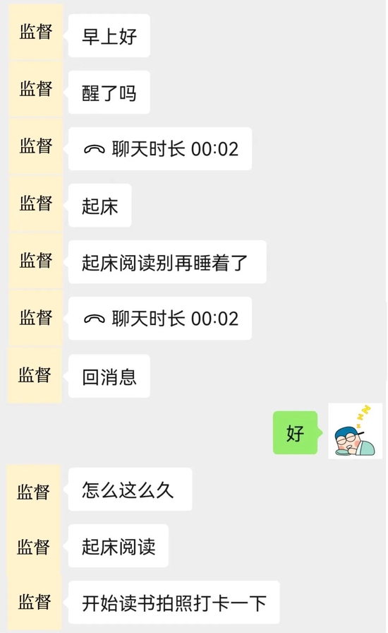 4月5日,那是在正式开始监督的前一天,小巴把自己计划好的监督细则微信发给林钰。她同时拿走了电话号码,并强调说:“手机不要静音、七点半给你发消息,没有醒的话我会打电话叫醒。”