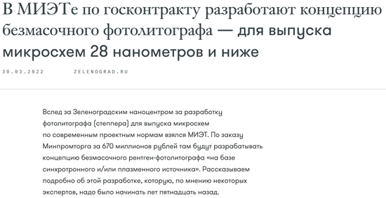 2022年3月底,俄国本地信源宣布:贸易与工业部拨款6.7亿卢布(约5100万人民币),让莫斯科国立电子技术学院(MIET)进行X射线光刻机的相关研究,以期尽早开发出基于X射线同步辐射和/或等离子电浆技术的无掩膜光刻机。