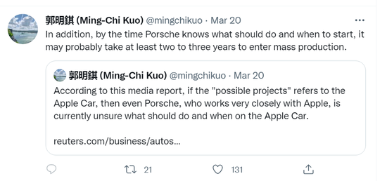 但是,郭明錤事后在Twitter上指出,如果保时捷要与苹果合作,那么至少需要等2-3年的时间,才能参与到苹果的大规模量产。因为目前苹果造车还有很多的不确定性。