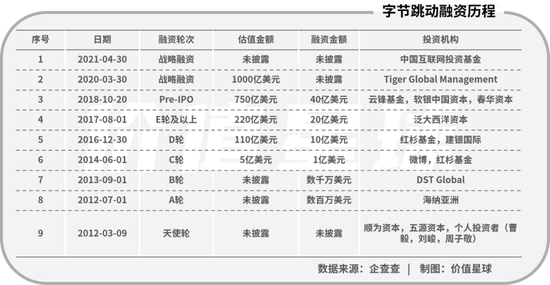 字节跳动的估值自然亮眼,但是却离不开投资者的“滋养”。企查查数据显示,2012年-2021年,字节跳动共完成九轮融资。融资规模与日俱增。比如,2017年字节跳动获得20亿美元E轮融资,2018年又获得40亿美元Pre-IPO融资。