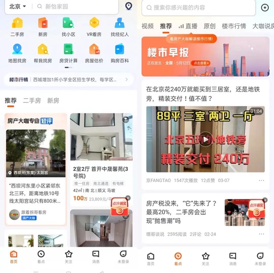 与快手当下仍主要依靠主播导流卖房的尝试不同,幸福里的路子与早期互联网房产公司类似,都是聚合性质的房产信息平台,同时接入了我爱我家、麦田房产等房产中介平台。与贝壳App感官上最大的不同在于,字节跳动在幸福里App内加入了不少信息流内容。