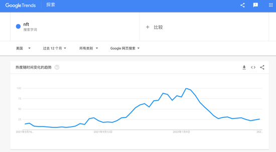 Google Trends相关数据也明确显示,从今年1月开始,人们对于NFT词汇的搜索数量有着明显减少。