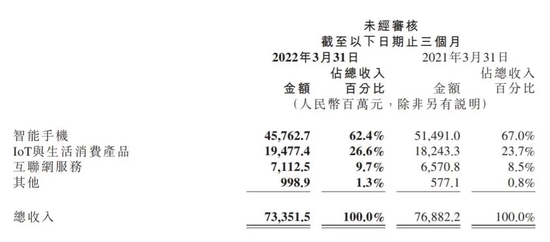 智能手机业务也成为小米三大主要业务线中,唯一出现收入同比下降的业务,当季收入458亿元,同比下滑11.1%。