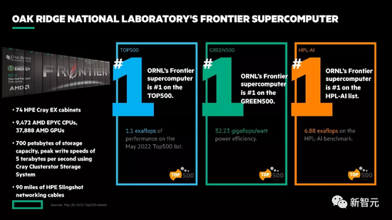 除了如此炫目的算力之外,Frontier还是全球跑AI最快的超级电脑之一。在HPL-AI基准的混合精度性能测试中,Frontier跑出了6.88 ExaFlops的成绩。