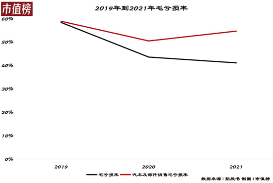 2019年—2021年,威马车辆及部件销售业务的毛亏损率分别为58.8%、50.4%和54.6%,整体亏损收窄幅度小,且2021年是在恶化的。