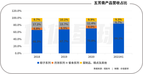 2018至2021年上半年,五芳斋粽子系列产品收入分别为15.02亿元、16.09亿元、16.44亿元和17.07亿元,占公司主营业务收入的比例稳定在七成左右,由于2021年报告期内没有包含中秋节,粽子系列营收达到84.06%。