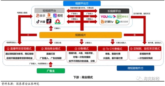 国泰君安证券在2022年5月发布的网络微短剧产业研究系列报告中提到,目前微短剧在长视频平台和短视频平台的商业模式稍有不同,前者偏B2B,主要依靠平台版权采买、播放分账等;后者偏B2C,在打赏分账、内容营销等变现选项之外,微短剧吸粉后直播带货转化渐成主流。