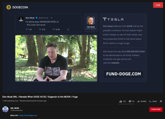 去年5月初,骗子利用马斯克的旧视频,配上假的马斯克推文,狂骗超过1000万美元,而YouTube是重灾区,骗子从这里导流量骗了900万美元。