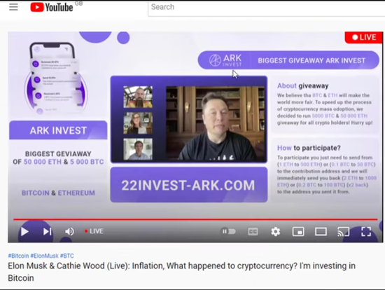 “事发地”还是YouTube。骗子抛出一段修改过的视频,原视频是马斯克、推特创始人杰克·多西以及凯瑟琳讨论加密货币,编辑后变成了关于方舟投资的推介。