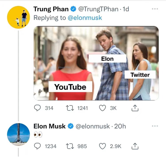 有人贴出了经典“朝三暮四”表情包,“马斯克”望向擦肩而过的YouTube,一旁的推特投去惊讶与愤怒的眼神……而马斯克翻了这条评论的牌子,一起看热闹。
