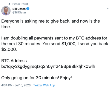 2020年,比尔·盖茨、奥巴马、巴菲特等名人的推特被盗,骗子发布比特币诈骗消息,同样是熟悉的“送鸡蛋”套路,你给我1000美元,我还你2000美元。