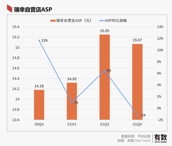 在2021年,瑞幸的平均销售价格(ASP)终于成功的从14块站上了15块。这主要是由于瑞幸虽然还在发券,但显然是越来越少了。