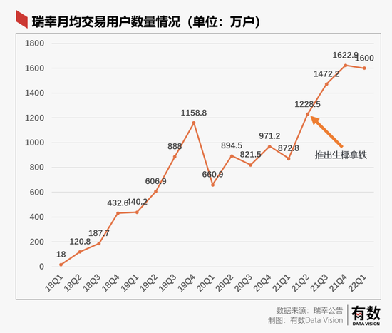 用户数的触顶跟爆款有很大的关系,在生椰拿铁爆火后的次月,单月卖了一千万杯,爆款带来的一千万杯是瑞幸能够有效提升用户数的关键所在。