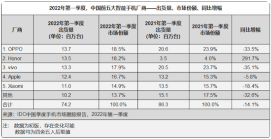 2007年,OPPO开始切入功能手机市场,2011年转型做智能手机,以高价格、高利润、极高的三四线城市市场占有率成为中国智能手机行业的头部玩家。2016年,OPPO成为中国区手机出货量第一的手机品牌。在2017年-2019年间手机厂商“贴身肉搏”的惨烈竞争中,OPPO每年的智能手机销售量都超过了1亿台。据IDC公布的数据,2022年第一季度国内智能手机销量排行榜,OPPO以1370万台的出货量占据首位,荣耀和vivo紧随其后,苹果却身居第四;在全球市场,OPPO以2740万台的出货量排名第四。