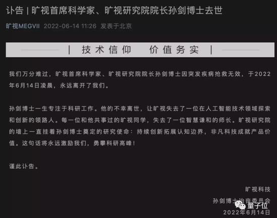 旷视也在讣告中表达了对孙剑博士离去的痛心: