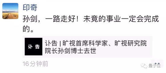 对于孙剑博士的离世,旷视联合创始人兼CEO印奇发布朋友圈悼念: