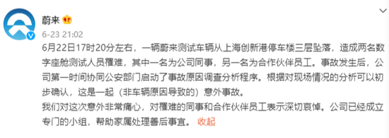 6月23日,蔚来官方微博对此次事故回应称,两名遇难者中,一名为公司同事,另一名为合作伙伴员工,公司已经成立专门小组,帮助家属处理善后事宜。