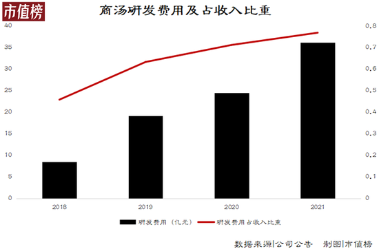 2021年,商汤研发费用为36.14亿元,占收入比重为76.9%,甚至比毛利率69.73%还高出7个百分点。也就是说,企业辛辛苦苦一年赚的毛利全都投入研发,还不够。