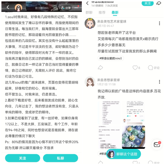 在Soul热闹的广场上,一些帖子带着#老用户、#怀念以前的Soul等标签,选择留下的早期Souler们便在这里抱团取暖。