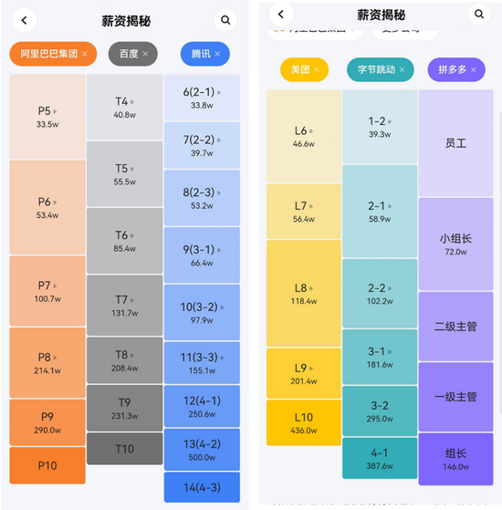 根据脉脉的统计,各大厂各职级大致的薪资中位数如下: