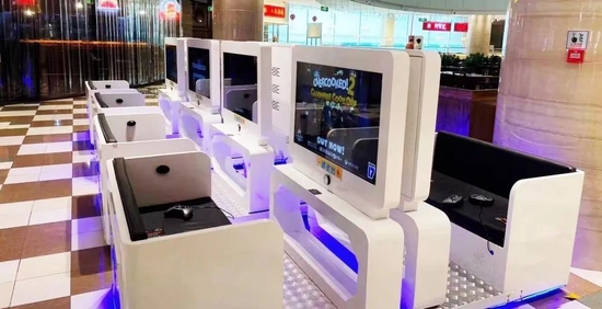 走近看,与电视大小相近显示器连接着一排沙发座椅,一台机器可以容纳两人。机身下拉出两根电线,另一头连着的是游戏手柄——原来,这是一台共享游戏主机。