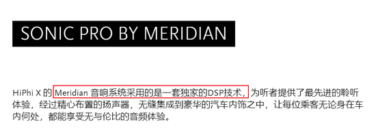 说明中没有提到硬件设备上的相关的支持,说的是 HiPhi X 跟英国之宝合作的是音响系统,具体来说采用的是独家 DSP 技术。