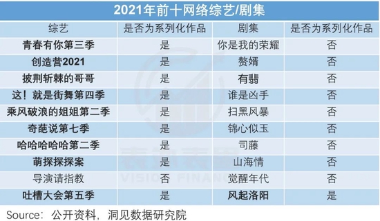 如下图,2021年排名前十的国产剧和网综中,系列化剧集只有一部:《风起洛阳》(系列第一部);系列化综艺却有9部,占比九成(《萌探探探案》《披荆斩棘的哥哥》为系列第一部)。