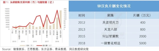 就直观数据看,2013-2018年,部分头部影视剧中的主演片酬数据,呈现较为明显的上升趋势。单个演员也一样,比如钟汉良,2012年《天涯明月刀》到2019年的《一路繁花相送》,其片酬涨幅超过十倍。